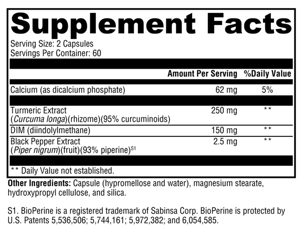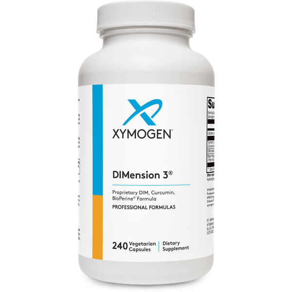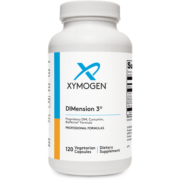 DIMension 3® represents a three-dimensional approach to supporting healthy estrogen metabolism. Research suggests that diindolylmethane (DIM), curcumin (from turmeric extract), and the patented black pepper extract BioPerine® support balanced estrogen metabolism.*
