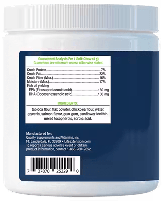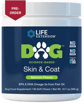 Life Extension® DOG Skin & Coat features a pure, high-potency omega-3 fish oil formula. The EPA & DHA fatty acids in fish oil have been shown to help relieve occasional skin discomfort. These healthful nutrients also help promote overall skin and coat health in dogs.