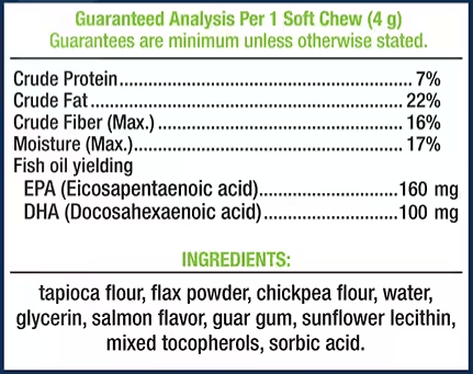 Ingredients: tapioca flour, flax powder, chickpea flour, water, glycerin, salmon flavor, guar gum, sunflower lecithin, mixed tocopherols, sorbic acid.