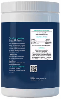 We want our pets to live long, healthy lives. That’s why we created Life Extension® DOG—a line of Fur-ever healthy formulas that are made with the same quality and attention to detail as all our supplements. This stress and behavior formula is perfect for dogs of all breeds, shapes and sizes. Just see the feeding instructions on the label for how many bacon-flavored soft chews to give your pet to keep them ready for mischief, adventures, and everything in between.