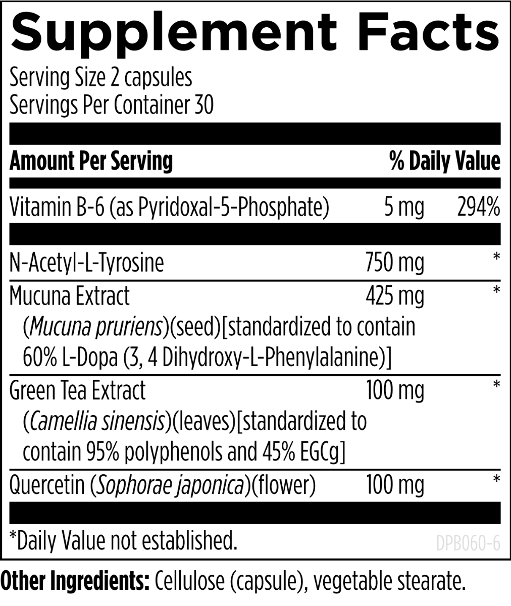 The primary ingredient in DopaBoost™ is Mucuna pruriens, a botanical that naturally contains L-Dopa, the metabolic precursor to dopamine, which can cross the blood-brain barrier. Additional ingredients include epigallocatechin gallate (EGCg), acetyl-L-tyrosine, quercetin, and vitamin B6, all selected for their synergistic roles in the production and regulation of dopamine.*