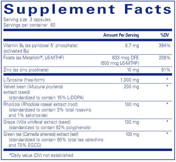 Supports dopamine production and maintains healthy reuptake for daily mental function and sharpness.