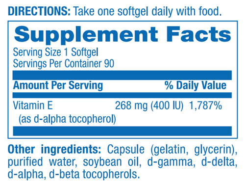 400 IU of 100 % pure natural d-alpha tocopherol vitamin E in a base of mixed tocopherols in an easy to swallow soft gelatin capsule. Esterified with acetate for Vitamin E stabilization.