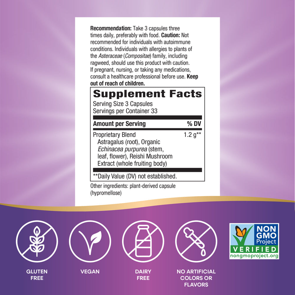 This herbal blend of Echinacea, Astragalus, and an extract from the adaptogenic mushroom Reishi helps support immune function.*