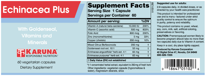 Echinacea Plus combines a well-researched botanical pair and several vitamins, minerals, and phytonutrients into a comprehensive formula for immune support. Both Echinacea purpurea and Echinacea angustifolia contain polysaccharides that help stimulate macrophage activation and cytokine production. Echinacea Plus also contains goldenseal, a rich source of berberine, which exerts antagonistic effects on microbial metabolism and stimulates the humoral immune response by supporting immunoglobulin production. Vitamin C, bioflavonoids, vitamin A, folic acid and zinc (with balancing copper) are included to provide complete immune support.