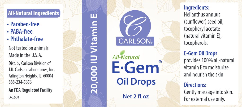 E-Gem® Oil Drops provide vitamin E to help moisturize and hydrate our skin, leaving it looking and feeling softer. Vitamin E is found in high amounts in the outer layer of the skin and plays an important role in antioxidant protection. E-Gem® Oil Drops can be massaged into the skin or added to a bath. Help protect and nourish your skin with Carlson E-Gem® Oil Drops.