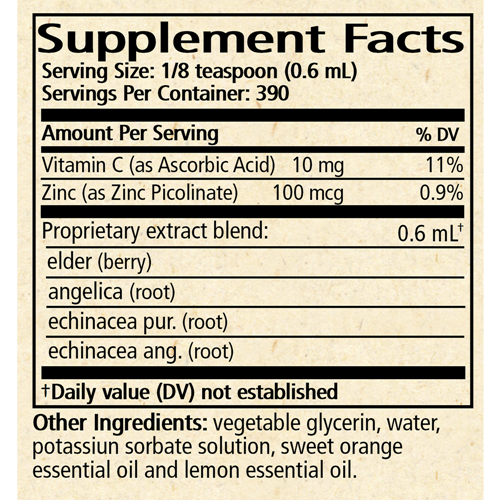 Ingredients: Elder berry, vitamin C, echinacea, osha, zinc picolinate, and sweet orange essential oil in a base of vegetable glycerin and potassium sorbate 0.1%. Blended from 3:1 solid extract.