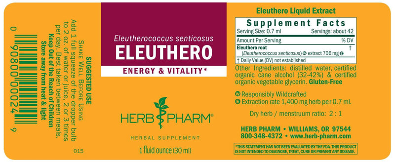 Herb Pharm prepares Eleuthero from the roots of Eleutherococcus senticosus shrubs which are responsibly wildcrafted in their wild native habitat. Herb Pharm extract is twice as concentrated (2 : 1) as the official Eleuthero extract made according to the Russian pharmacopoeia.