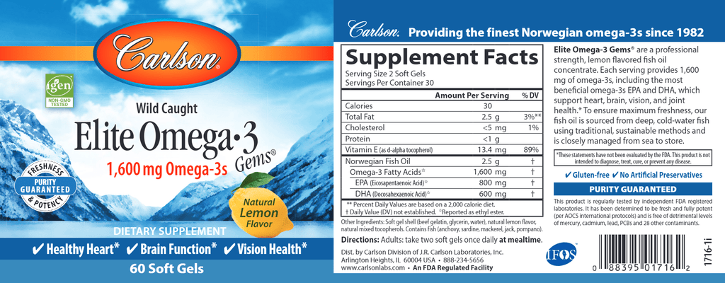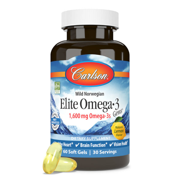 Carlson Elite Omega-3 Gems® is a professional-strength fish oil concentrate. A single serving provides 1,600 mg of omega-3s, including the important omega-3s EPA and DHA, which promote heart, brain, vision, and joint health. To ensure maximum freshness, Elite Omega-3 Gems® is closely managed from sea to store. We source the highest quality, deep, cold-water fish using traditional, sustainable methods. And like all Carlson omega-3s, freshness, potency, and purity are guaranteed.