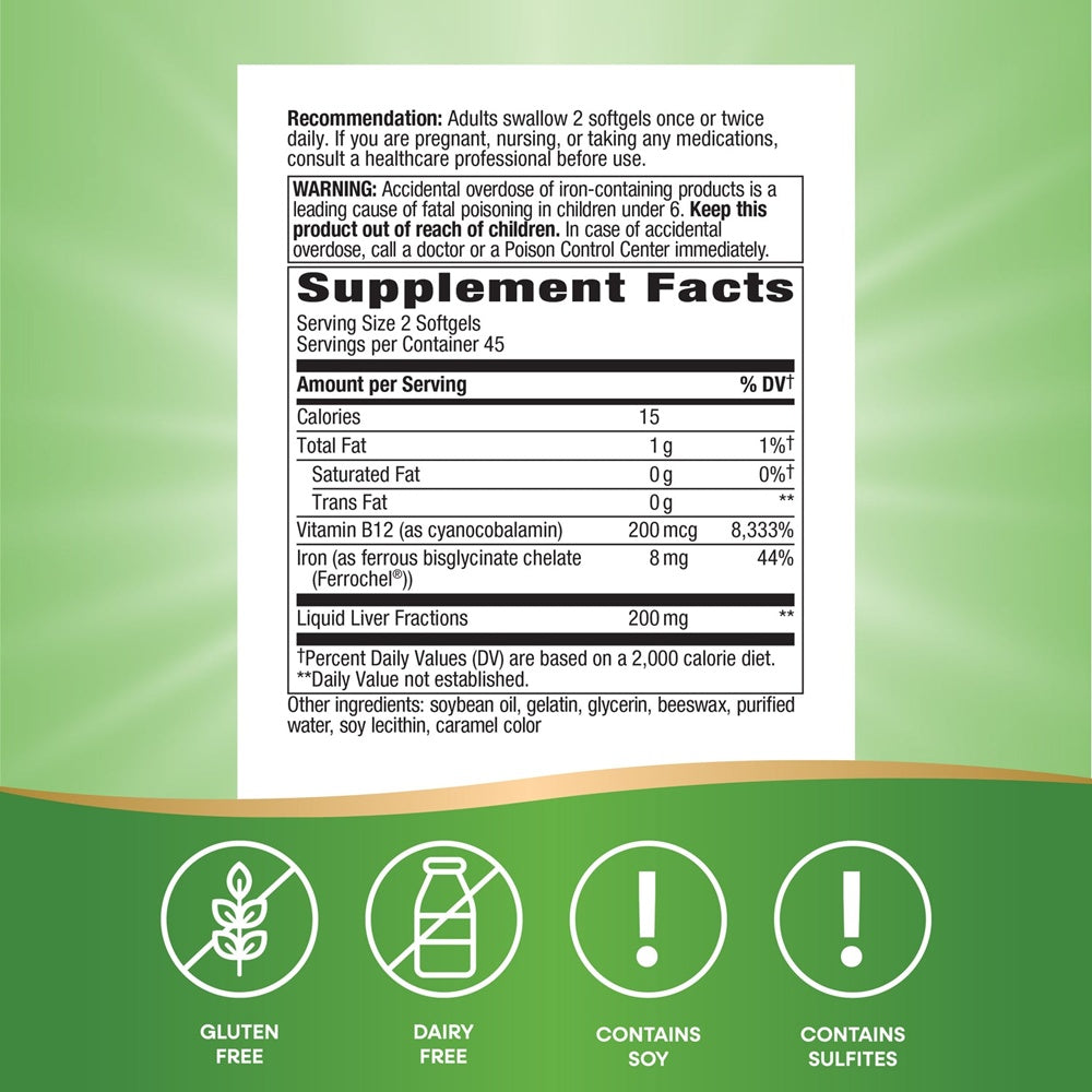 Nature's Way Energizing Iron supports healthy red blood cells.* Energizing Iron provides 8 mg of iron as ferrous bisglycinate chelate per 2-softgel serving. Plus, the addition of vitamin B12 as cyanocobalamin supports the body's red blood cells.*