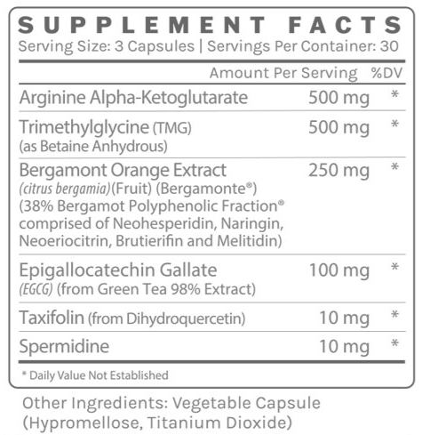 FEATURES: Arginine alpha-ketoglutarate supports mitochondrial function, helping to enhance cellular energy production and overall metabolic health. Trimethylglycine, also known as TMG, aids in epigenetic regulation, promoting a healthy aging process at the cellular level. Bergamonte, a branded version of bergamot extract, offers potent antioxidant properties and supports cardiovascular health, further contributing to overall well-being. EGCG, derived from green tea, serves as one of them most powerful natural antioxidant Taxifolin act as powerful antioxidants, assisting in cellular protection and promoting optimal cellular function. Spermidine, a natural compound found in various foods, supports the process of autophagy, aiding in the removal of damaged cellular components and promoting cellular renewal.