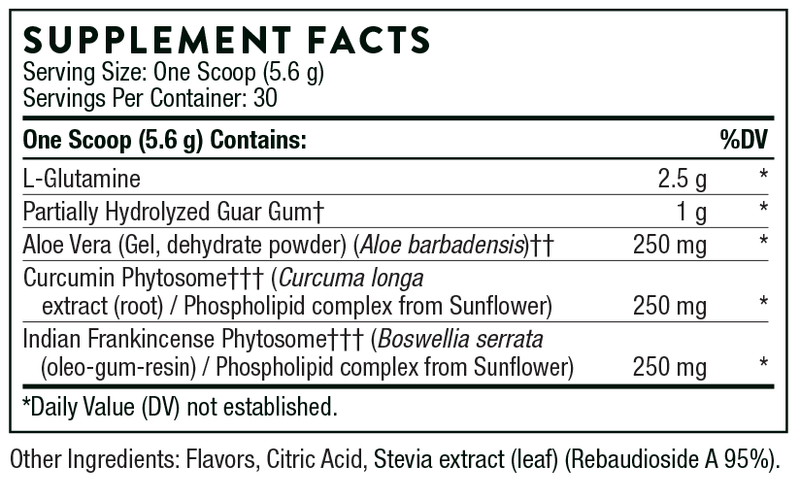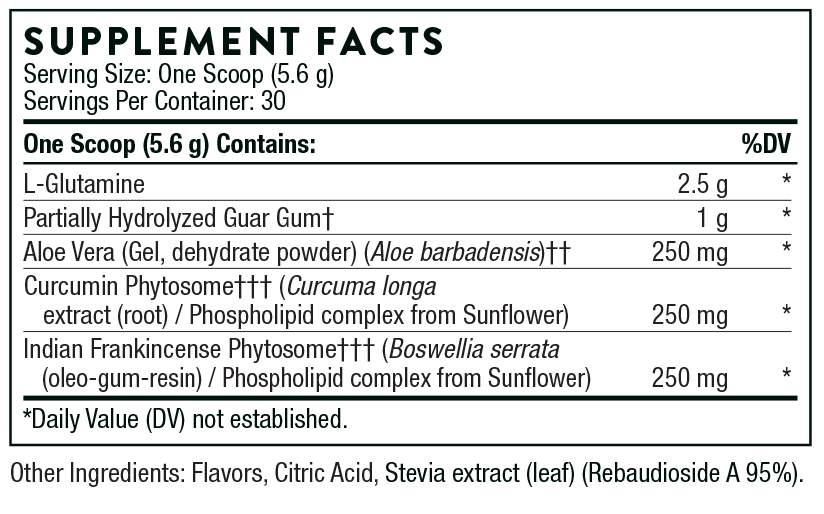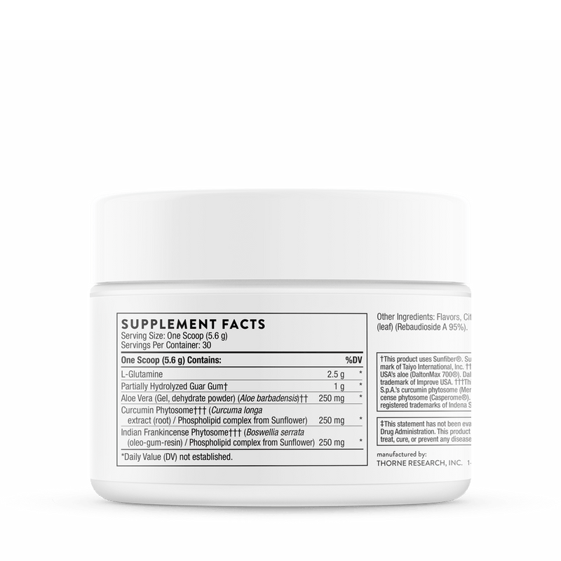 EnteroMend® combines the mucosa-protective effects of L-glutamine with highly absorbable botanical complexes to provide a unique amino acid/botanical formula that supports overall intestinal health.* Meriva® and Casperome® (curcumin and Boswellia phytosomes for enhanced absorption) help maintain a healthy inflammatory response in the GI tract.* DaltonMax 700®, a unique aloe extract with 200:1-potency, soothes intestinal mucus membranes.* Sunfiber® promotes healthy gut flora, normal butyrate levels, and bowel regularity.* L-glutamine is present to decrease intestinal permeability.* EnteroMend is a great-tasting orange-vanilla flavored powder and is easy to mix in water or a beverage of choice.