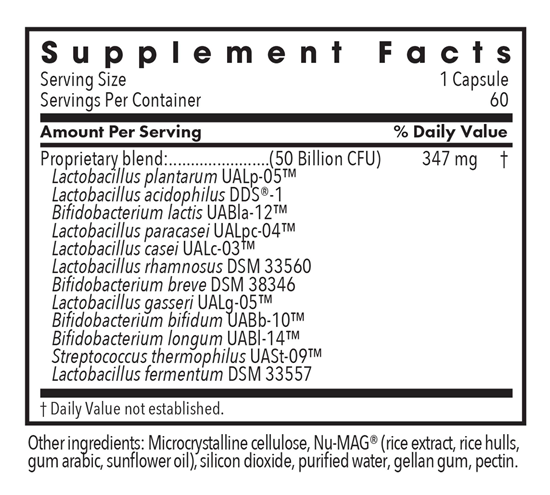 Twelve human probiotic strains to support both upper and lower GI health.* 50 billion CFUs per delayed-release vegetarian capsules.* Non-dairy, gluten-free, and stable at room temperature - no refrigeration required.