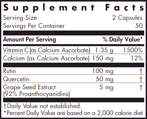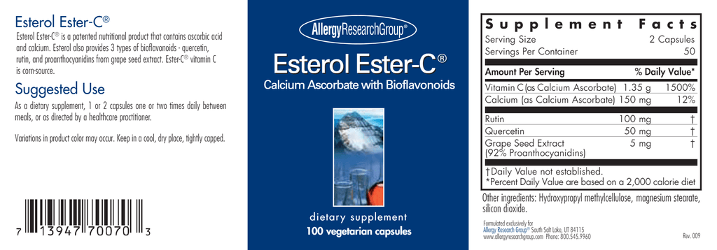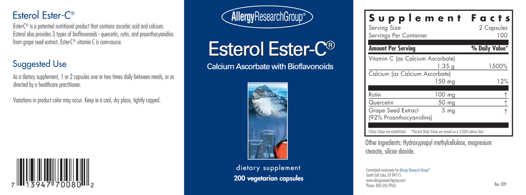 Esterol Ester-C® provides highly bioavailable vitamin C as Ester-C® calcium ascorbate, buffered for improved tolerance and supported by bioflavonoids quercetin, rutin, and grape seed extract.* Research shows Ester-C® enhances vitamin C uptake by immune cells, promotes immune resilience, supports antioxidant defenses, and aids in collagen, adrenal, and connective tissue health.* Two capsules of Esterol Ester-C® contain 1.35 grams of vitamin C as calcium ascorbate.