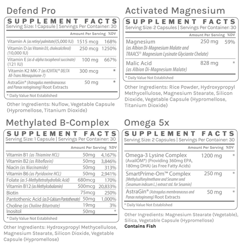 1 x Defend Pro, the A, D (10,000 IU), K powerhouse with the addition of AstraGin for optimized nutrient absorption all aimed at supporting healthy bones, cardiovascular health, immune function and hormone metabolism.