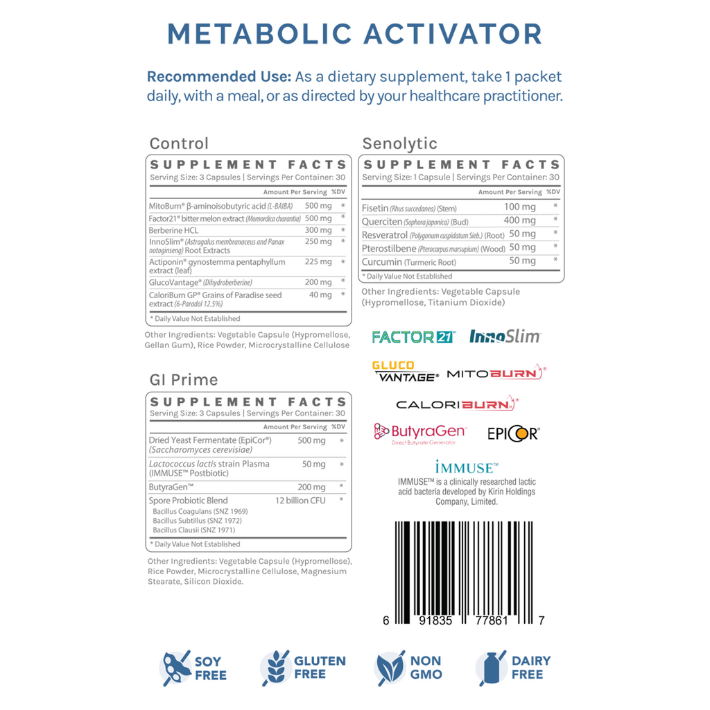 BENEFITS OF METABOLIC ACTIVATOR EXACTPAX™: The Metabolic Activator ExactPax™ utilizes cutting-edge formulations to support healthy glucose control, white-to-brown fat conversion, improved insulin sensitivity via elevated GLP-1 signaling, AMPK activation, optimal gut flora, colonocyte health, and gut permeability. The Metabolic Activator ExactPax" is the perfect tool for patients needing slight metabolic support or even those on comprehensive weight loss programs.