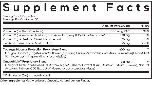 Codeage Eyes vitamins is inspired by AREDS 2. It combines AREDS2 ingredients with a full suite of nutrients along with carotenoids and flavonoids. Codeage Eyes supplement provides a nutritional approach to ocular wellness by offering an all-in-one source of vitamins for eyes.* Codeage Eyes provides 20 mg of lutein vitamins along with 10mg of meso-zeaxanthin and zeaxanthin combined with astaxanthin, saffron, bilberry extracts, vegan Omega-3, vitamins A, C, E and zinc. This formula also features Eyebright.