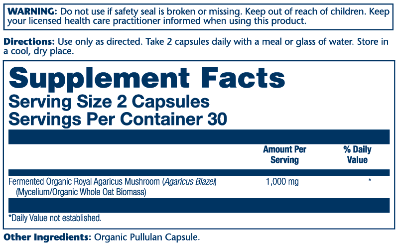 Providing your body with the natural cardiovascular support and immune boosting benefits of Agaricus mushrooms is easy with Solaray.* These powerful nutrients are conveniently contained in easy to consume capsules. Just two vegetarian capsules are all you need each day to provide your body with the wholesome support of Agaricus mushrooms.