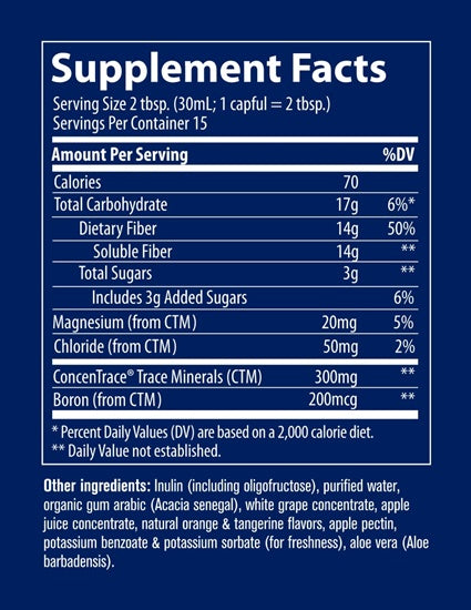 Fiber 14g is a unique blend of inulin fiber and organic acacia fiber from all-natural sources in a convenient, great-tasting liquid. Diets high in fiber have also been shown to help prevent occasional constipation, support good colon health, and promote and support cardiovascular health.*