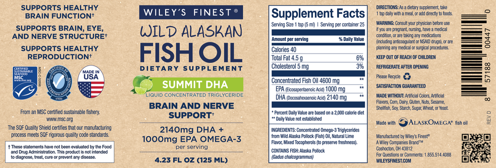 Summit DHA is a great-tasting lime flavored Omega-3 liquid. Wiley's Finest naturally-occurring DHA from sustainably harvested wild Alaska Pollock oil benefits everyone looking to increase their DHA intake. Their convenient formula can be taken by the spoonful or added to cold food and smoothies.