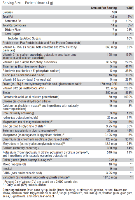 DIRECTIONS: Mix the contents of one packet (41 g) in 6-8 oz cold water and consume. Adjust amount of water according to thickness desired. May be used as a snack or meal supplement, or taken as directed by your healthcare professional. Consult your healthcare professional prior to use. Individuals taking medication should discuss potential interactions with their healthcare professional.