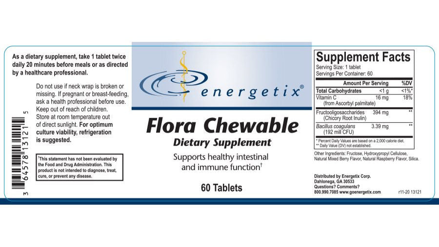 Flora Chewable contains the spore form probiotic Bacillus coagulans and prebiotic fructooligosaccharides (FOS) to help support normal immune and digestive response. Bacillus coagulans—a lactic acid-producing bacterial endospore nourished by the FOS—aids in maintaining normal intestinal microflora balance.