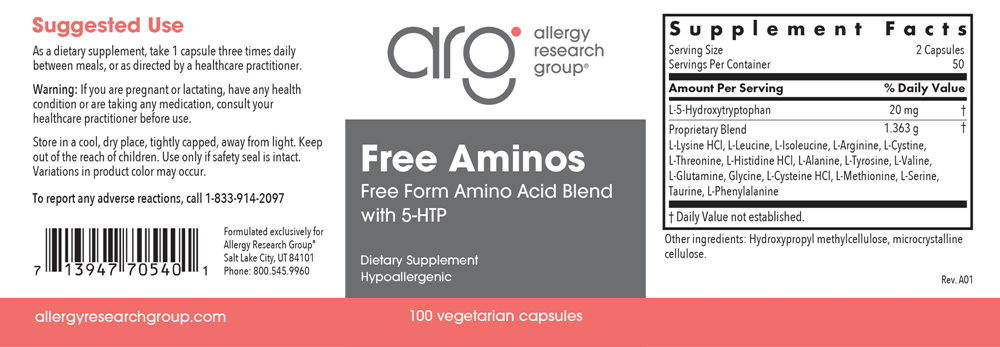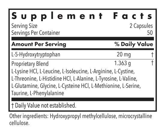 A formulation of 17 naturally occurring amino acids in their free forms, including 9 essential amino acids, as well as L-5-Hydroxytryptophan (5-HTP).