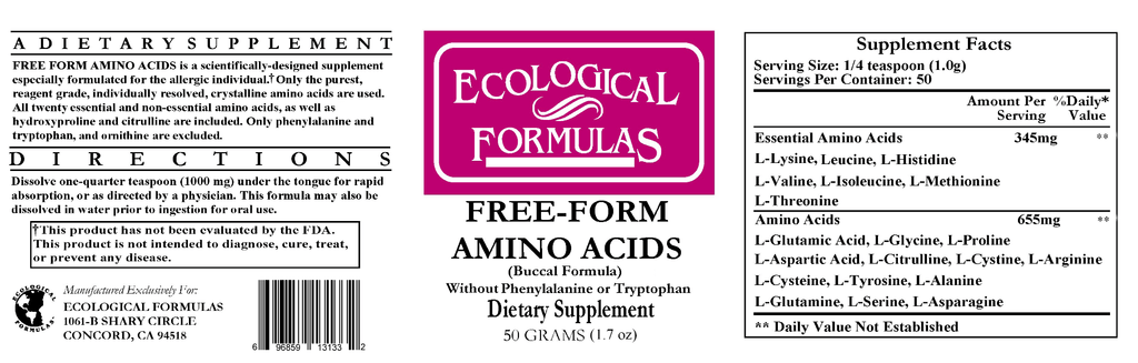Free-Form Amino Acids 50 g by Ecological Formulas is a dietary supplement designed to provide the body with a comprehensive range of essential amino acids for the proper production of compounds, cells and tissues that ensure good health.* Free-Form Amino Acids 50 g contains all 21 essential and non-essential amino acids required by the body to function properly on a daily basis, in addition to hydroxyproline and citrulline.*