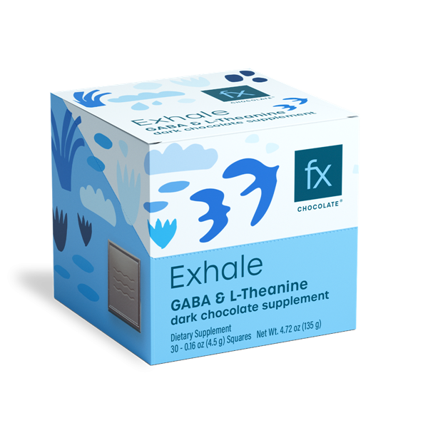 Fx Chocolate® Exhale contains 100 mg of gamma-aminobutyric acid (GABA) and 100 mg of L-theanine per serving to promote mental and emotional calm without impairing focus and attention.* GABA is a naturally occurring amino acid found in the brain and the main inhibitory neurotransmitter in the central nervous system that works by slowing down the activity of nerve cells and preventing them from over-firing, helping to support a normal response to stress and occasional anxiety.* L-theanine is an amino acid found mainly in green tea and is known to promote a sense of calm and a healthy response to stress.* GABA and L-theanine may help promote restful sleep as a result of supporting a calm mind.* Fx Chocolate® contains zero grams of sugar and is sweetened with allulose, a sweetening agent that is found naturally in jackfruit, figs, and raisins, with no bitterness or unpleasant aftertaste.