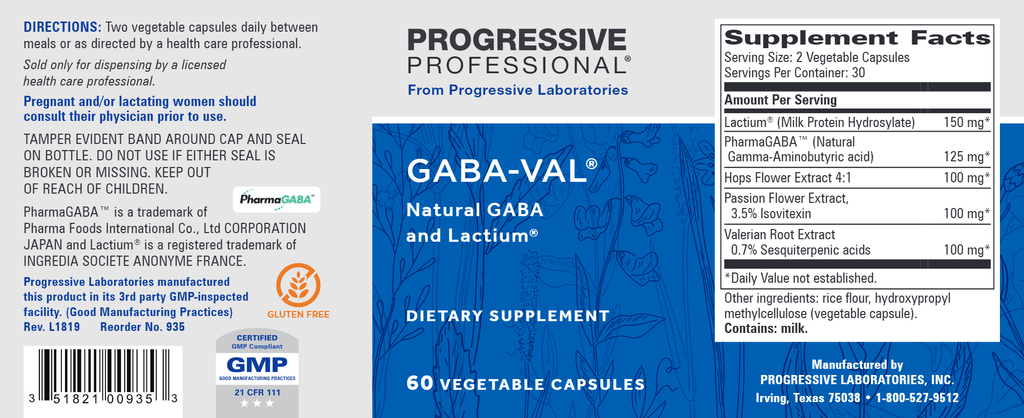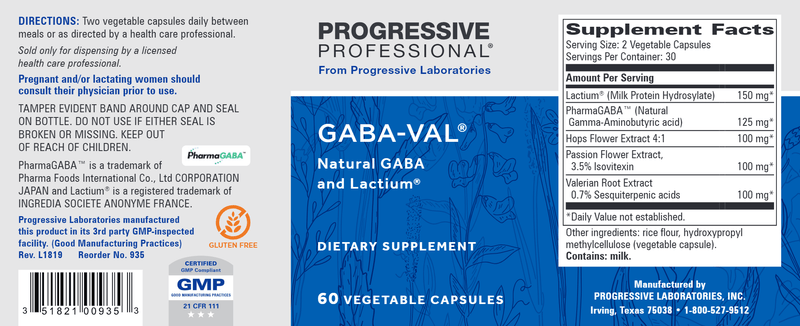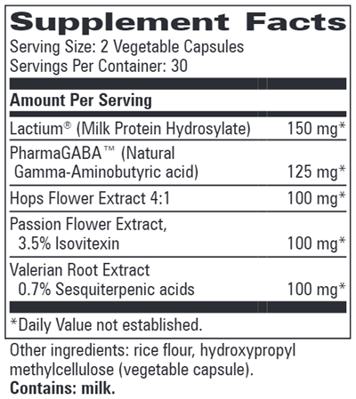 Gamma Amino Butyric Acid (GABA) is an amino acid neurotransmitter in the central nervous system which, when taken with niacinamide and inositol, supports relaxation and calmness. Vitamin B-1 (thiamine) supports a healthy nervous system and positive mental attitude. Magnesium is necessary for proper functioning of nerves, muscles and neuromuscular contractions. Glutamic Acid is used as fuel by the brain. Synergistic herbs (valerian root, hops pollen and passion flower) are added to support calmness and relaxation in various parts of the body. Brain tissue provides growth and repair factors for weak or exhausted brain cells and has a balancing effect.