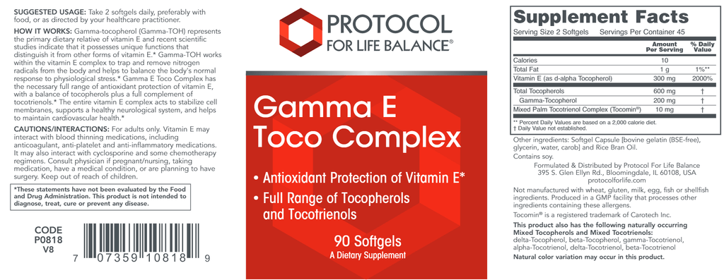 Gamma-tocopherol (Gamma-TOH) represents the primary dietary relative of vitamin E and recent scientific studies indicate that it possesses unique functions that distinguish it from other forms of vitamin E. Gamma-TOH works within the vitamin E complex to trap and remove nitrogen radicals from the body and helps to balance the body's normal response to physiological stress. Gamma E Toco Complex has the necessary full range of antioxidant protection of vitamin E, with a balance of tocopherols plus a full complement of tocotrienols. The entire vitamin E complex acts to stabilize cell membranes, supports a healthy neurological system, and helps to maintain cardiovascular health. Tocomin® is a registered trademark of Carotech Inc. This product also has the following naturally occurring Mixed Tocopherols and Mixed Tocotrienols: delta-Tocopherol, beta-Tocopherol, gamma-Tocotrienol, alpha-Tocotrienol, delta-Tocotrienol, beta-Tocotrienol
