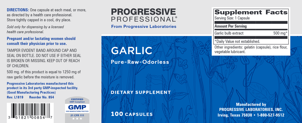 Garlic from Progressive Laboratories is a formula designed to support healthy blood pressure and cardiovascular health through the use of time-tested and clinically studied aged garlic extract. Our Garlic uses pure deodorized whole garlic – only the moisture has been removed. Five hundred milligrams is equivalent to 1250 milligrams of whole garlic before the moisture has been removed.