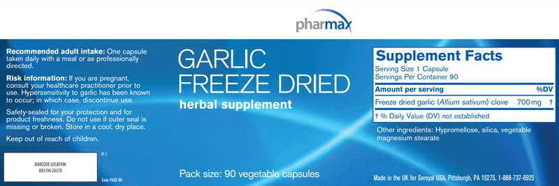 Garlic Freeze Dried provides 700 mg of garlic clove (Allium sativum) per day. Garlic is traditionally used in Herbal Medicine to support healthy upper respiratory tract health and to promote already normal blood lipid levels. It has also been used traditionally to help maintain cardiovascular health in adults.