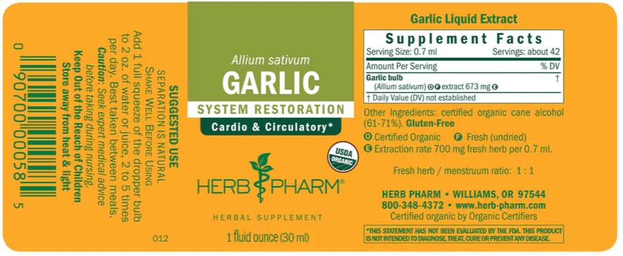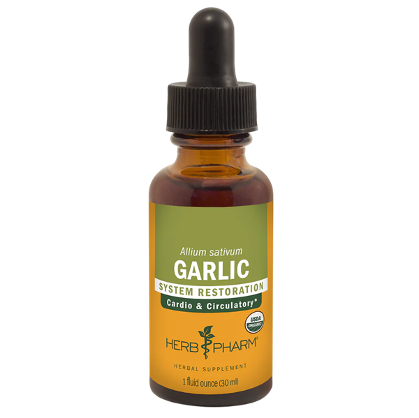 Herb Pharm prepares their Garlic Extract from the fresh, cured (never dried) bulb of Certified Organic Allium sativum plants. To assure optimal extraction of Garlic’s bioactive compounds, the bulbs are harvested only when fully matured, then extracted while still succulent.