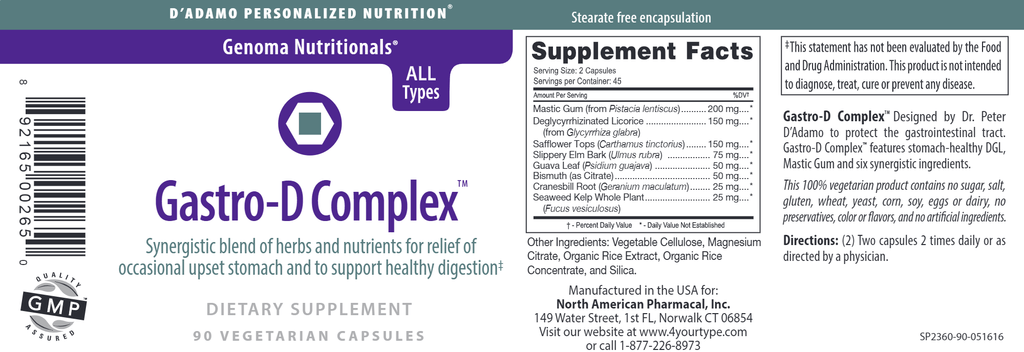 To support a healthy intestinal tract, Dr. Peter D'Adamo, author of Eat Right 4 Your Type, has designed Gastro-D Complex, a unique combination of herbs and minerals designed to soothe and calm occasional upset stomach.*