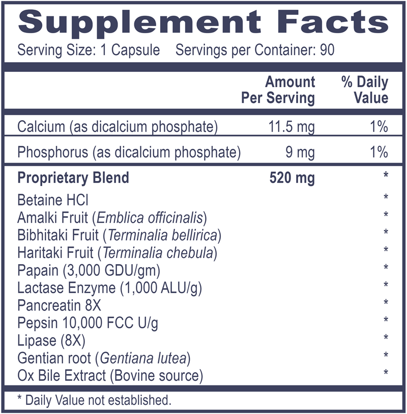 Gastrogest is an effective, broad-range supplement designed to help support the upper and lower gastrointestinal system. It contains a blend of betaine HCl, plant and pancreatic digestive enzymes, naturally occurring digestive-supporting fruits (bibhitaki & haritaki), gentian root, and ox bile. It is superiorly designed to target effective breakdown, assimilation, and absorption of nutrients and dietary factors. This product pairs well with GI Assist, Pro Flora Max and for extra pancreatic support Pro Multi Enzyme Complex and/or Pancreatin 8X.