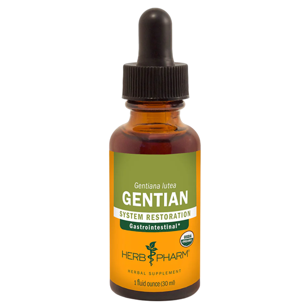 Herb Pharm prepares Gentian extract from the rhizome with root of Certified Organic Gentiana lutea plants. The rhizome with roots are harvested in spring or fall in France, then thoroughly dried and extracted.
