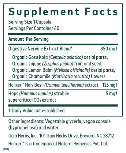 Digestive stress is extremely common and can cause a range of gastrointestinal problems. Gaia Pro’s GI Stress contains 125mg of clinically-studied Holixer™ Holy basil and a carefully formulated blend of digestive nervines, including gotu kola, jujube, lemon balm and chamomile, to help maintain a healthy stress response and digestive wellness. * As a rasayana and adaptogen, Holy basil maintains equilibrium associated with the stress system in the body.*