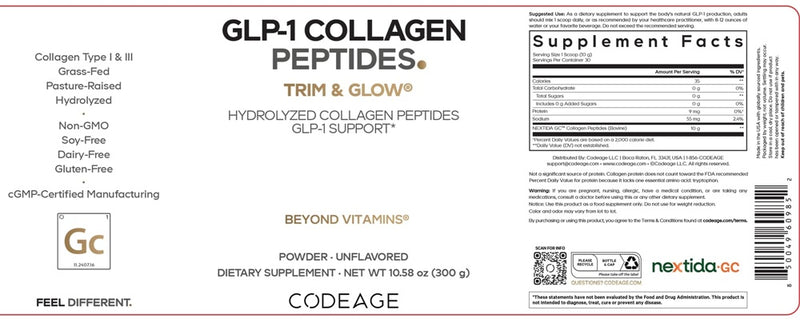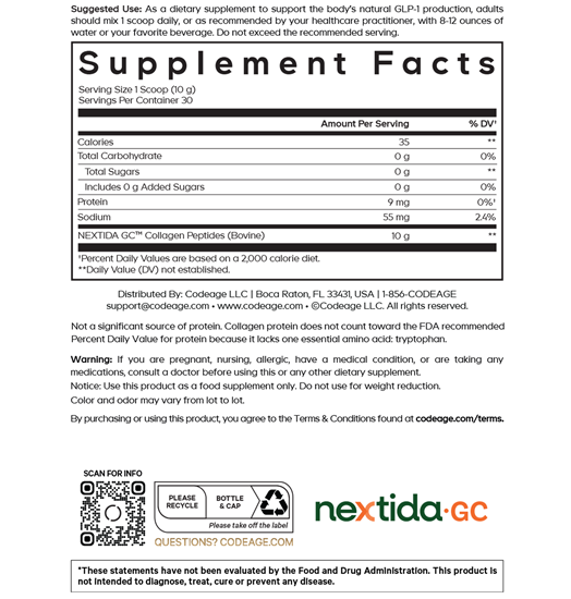 Codeage GLP-1 Collagen Peptides powder features Nextida GC, a modern, premium, hydrolyzed collagen powder from grass-fed bovine known for its specific and distinct peptide profile. This unflavored GLP-1 supplement powder blends seamlessly into beverages for a refined collagen experience.