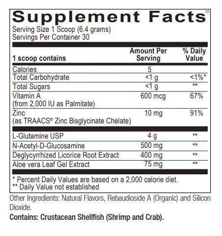 OVERVIEW: The purpose of the epithelium is to allow the digestion and absorption of dietary nutrients while keeping unwanted toxins, microbes and food particles from passing directly into the body. GlutaShield includes a high dose of L-glutamine (4 g), which serves as nutrition for the gut lining. It provides 400 mg of deglycyrrhizinated licorice root extract (DGL) and 75 mg of aloe vera extract, both of which protect and promote the health of the gut mucosa. N-acetyl glucosamine and zinc boost GI integrity. GlutaShield is available in delicious chocolate and vanilla flavors.