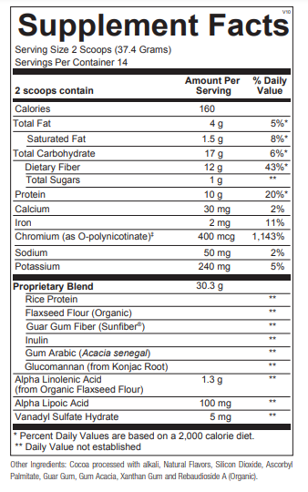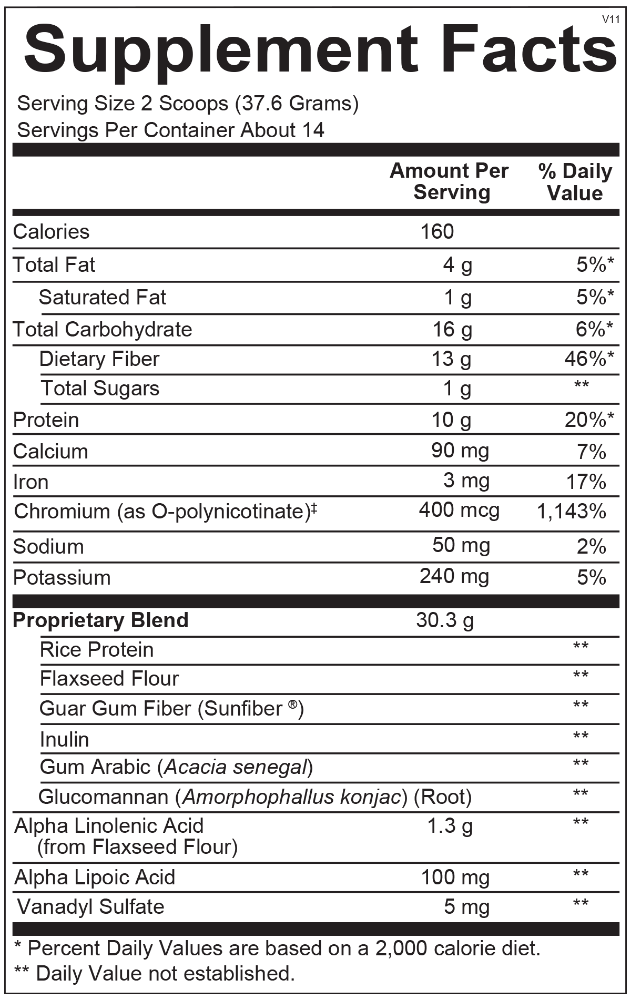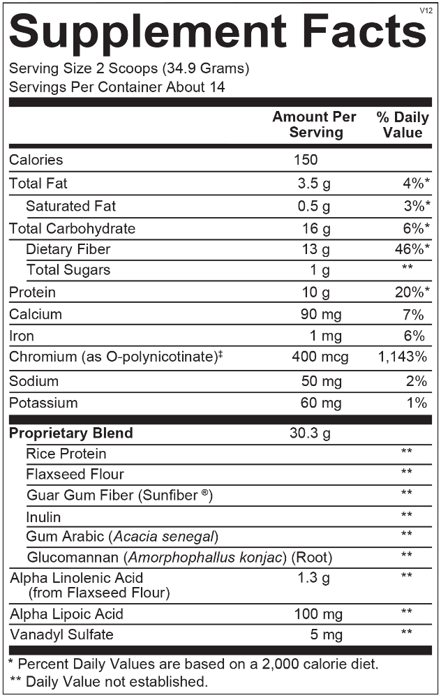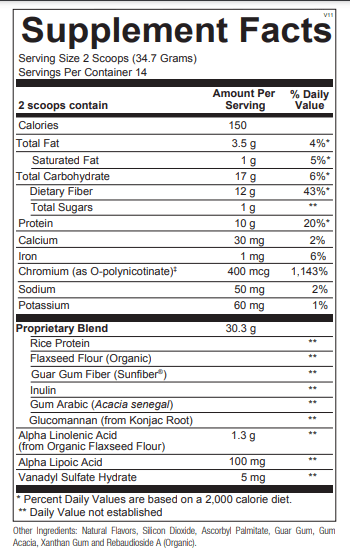 OVERVIEW: GlycemaCORE provides fiber, protein, omega-3 fatty acids, lipoic acid, chromium vanadyl sulfate, with no added sugar.