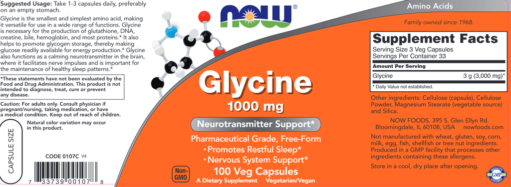 Glycine is the smallest and simplest amino acid, making it versatile for use in a wide range of functions. Glycine is necessary for the production of glutathione, DNA, creatine, bile, hemoglobin, and most proteins.* It also helps to promote glycogen storage, thereby making glucose readily available for energy production.* Glycine also functions as a calming neurotransmitter in the brain, where it facilitates nerve impulses and is important for the maintenance of healthy sleep patterns.*