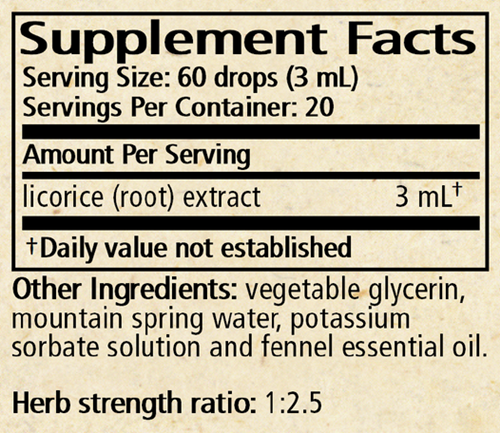 Ingredients: Licorice in a base of vegetable glycerin, mountain spring water and fennel essential oil with potassium sorbate solution 0.1%.