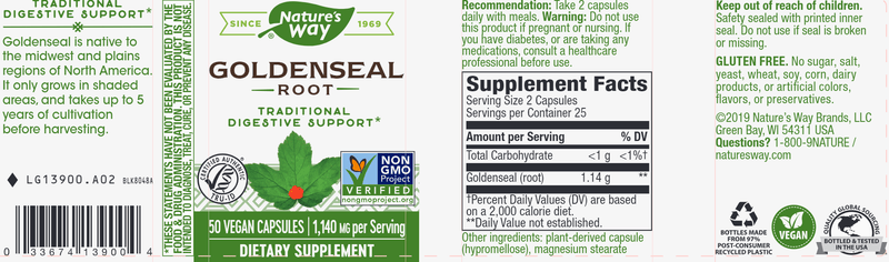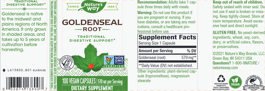 Nature's Way Goldenseal Root provides traditional digestive support.* Goldenseal is native to the midwest and plains regions of North America. It only grows in shaded areas, and takes up to 5 years of cultivation before harvesting.