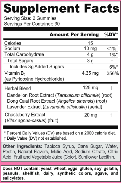 When PMS symptoms strike, it can be tricky to go with the flow, so to speak. Luckily, these delicious little gummies contain Chasteberry to help with some of the pre-menstruation frustration not-so-lovingly known as PMS. We’re talking relief for your mood swings & irritability. Breast tenderness? Ta-ta for now! We also added Vitamin B6 to support nervous system health* too. So ladies, don’t let PMS run the show.