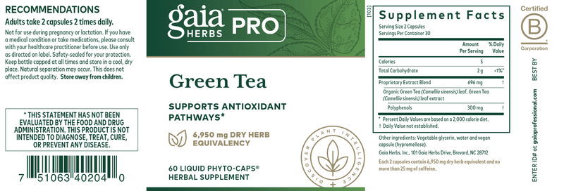 Green Tea is one of the richest documented sources of antioxidants. It contains Polyphenols that are known collectively as Catechins. Gaia Herbs’ Green Tea uses certified organic green tea leaves, extracted and concentrated to provide the full spectrum of phytochemicals naturally found in green tea leaves and contains 300 mg of Polyphenols per serving.