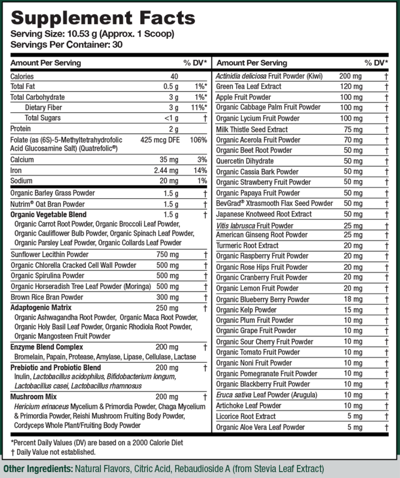 The phytonutrient and antioxidant benefits of a diet rich in dark greens and brightly colored fruits and vegetables in one delicious powder. Greens First contains certified organic fruits, vegetables, and barley grass which are first juiced, then spray dried at low temperatures, leaving all the important nutrients and live enzymes intact.