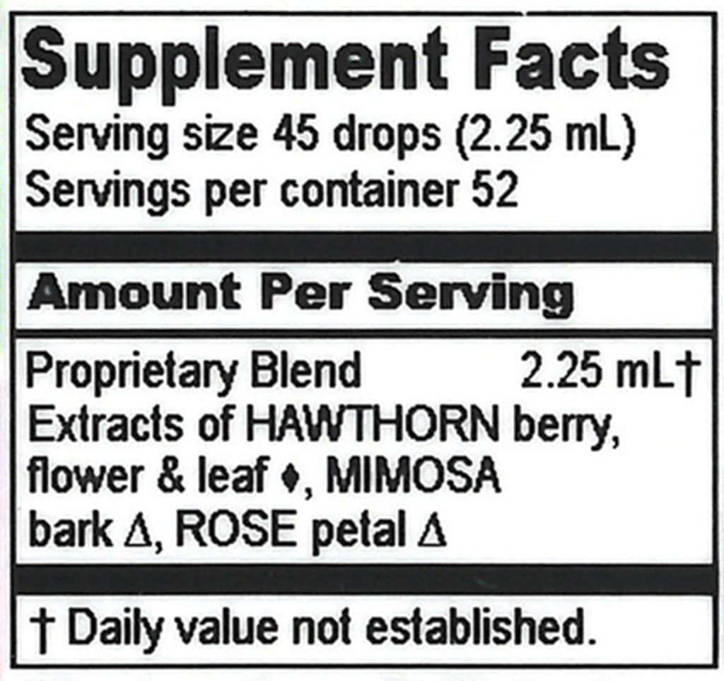 Hawthorn berries, flowers & leaf (Crataegus spp.), Mimosa bark (Albizia julibrissin), Rose petals (Rosa spp.)