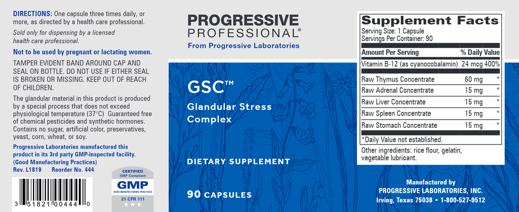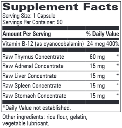 "GSC" contains all the glandular components needed to support the body during times of high mental and physical activity. Raw stomach concentrate is added to enhance nutrient absorption along with vitamin B-12 to support energy, red blood cells and RNA/DNA synthesis.