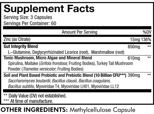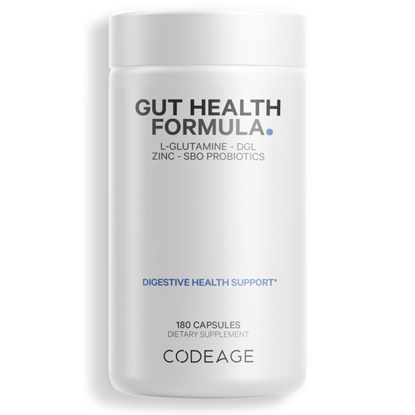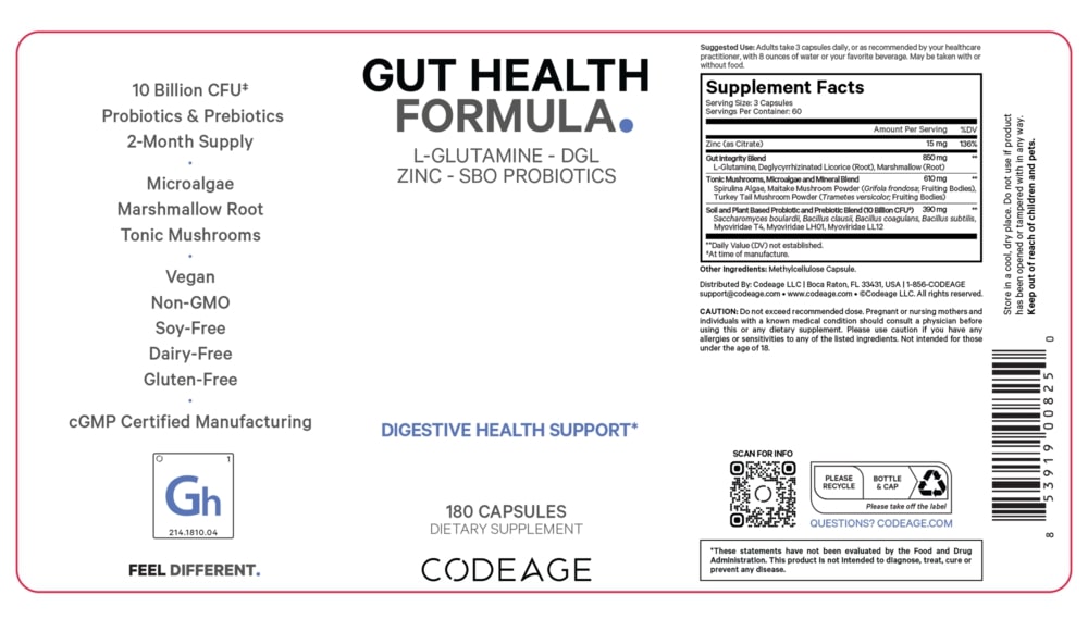 Codeage Gut Health Formula blend features high-quality prebiotics and probiotics with 10 Billion CFUs per serving, along with L-Glutamine, licorice root, and also a premium blend of minerals, fermented zinc, tonic mushrooms, microalgae, adaptogenic herbs, and bioavailable amino acids.